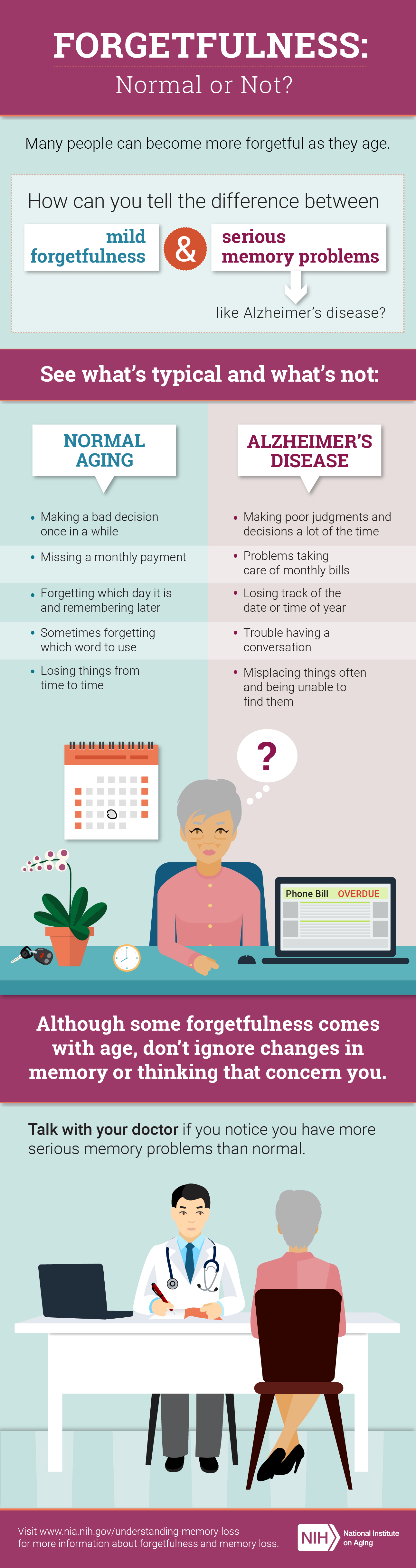 Many people worry about becoming forgetful as they age. They think it is the first sign of Alzheimer’s disease. But some forgetfulness can be a normal part of aging. Read the following infographic to learn more about forgetfulness related to normal aging and more serious memory problems.