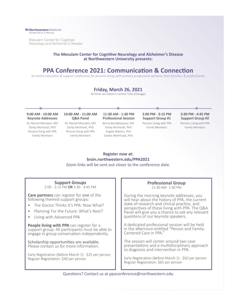 M.-Marsel Mesulam, MD, who first named the syndrome. Individuals with a PPA diagnosis and their families will be able to attend afternoon support groups, while professionals hear from a panel that includes a neurologist, social worker, speech language pathologist, and neuropsychologist.