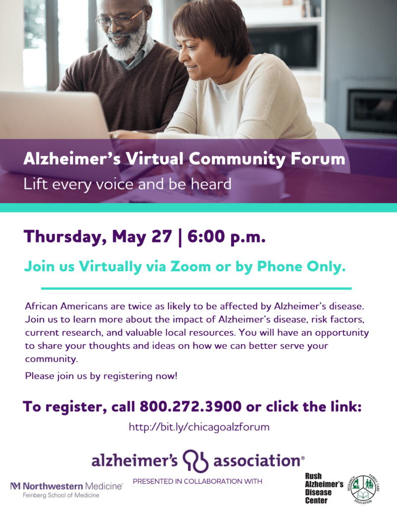 African Americans are twice as likely to be affected by Alzheimer’s Disease. Join us to learn more about the impact of Alzheimer’s Disease, risk factors, current research, and valuable local resources.