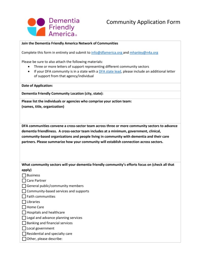 Dementia Friendly America recently updated their form for community recognition. It is the same process but the questions on the form are different. Any community applying for community recognition should use the new form.