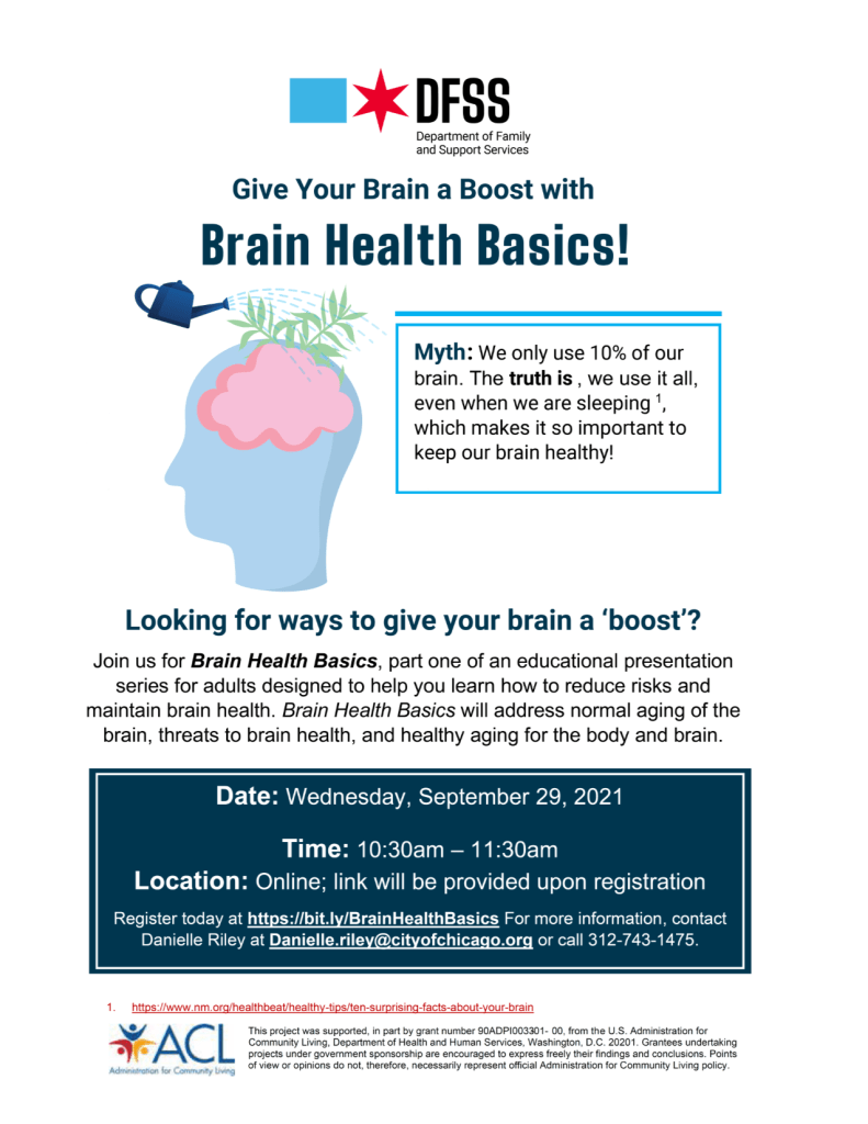 This event will address normal aging of the brain, threats to brain health, and healthy aging for the body and brain. For more information, email Danielle Riley at: Danielle.riley@cityofchicago.org or call (312)743-1475