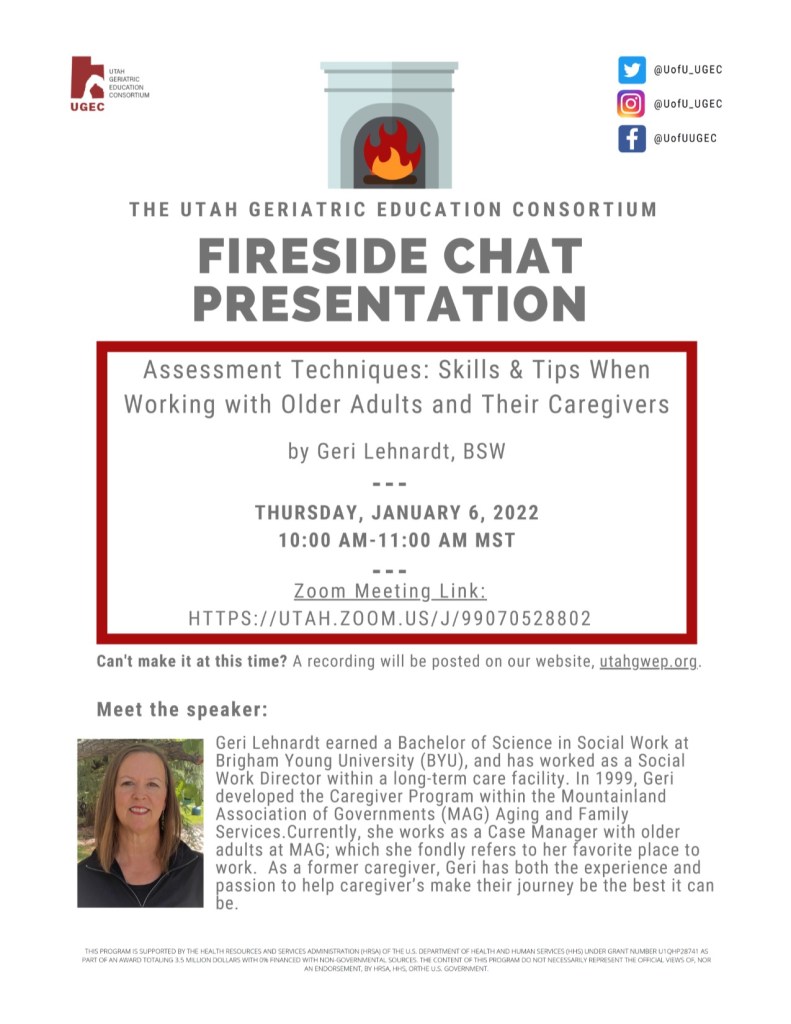 Presented by the Utah Geriatric Education Consortium (UGEC), this session will focus on assessment techniques, skills and tips when working with older adults and their caregivers. Join today at 11:00 AM, CST. Click here for the Zoom meeting link.