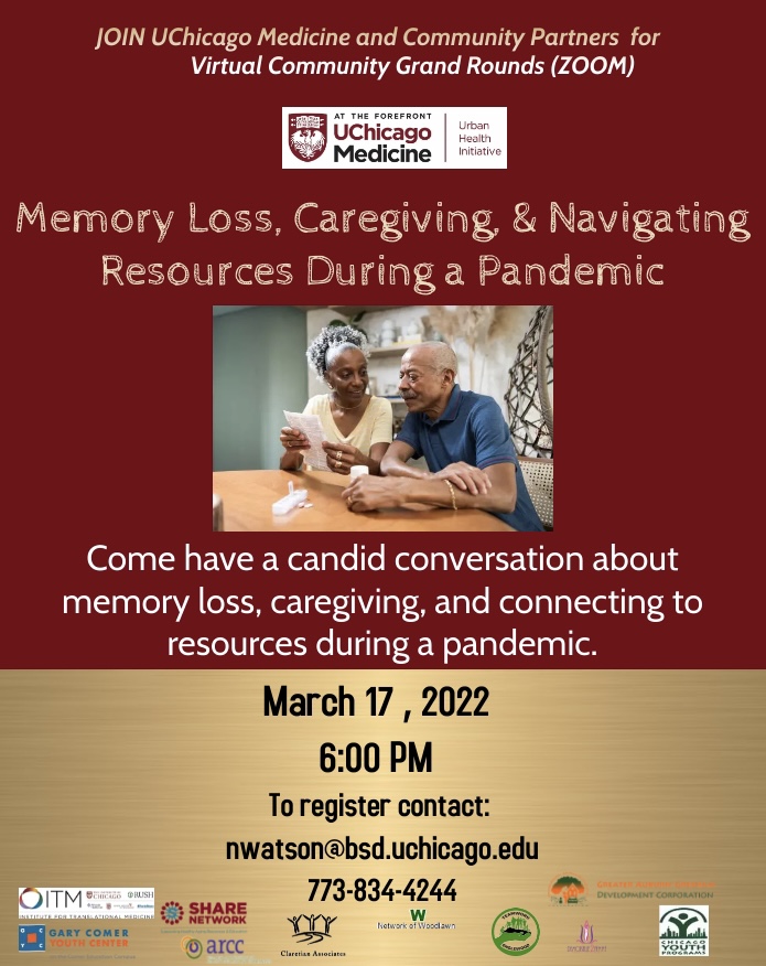 Tomorrow, Thursday, March 17th, is the virtual Community Grand Rounds (CGR), “Memory Loss, Caregiving & Navigating Resources During a Pandemic”. The CGR will be from 6:00pm-7:30pm. Please make sure that you register for the Zoom as soon as you receive this notice. The link to register is below.