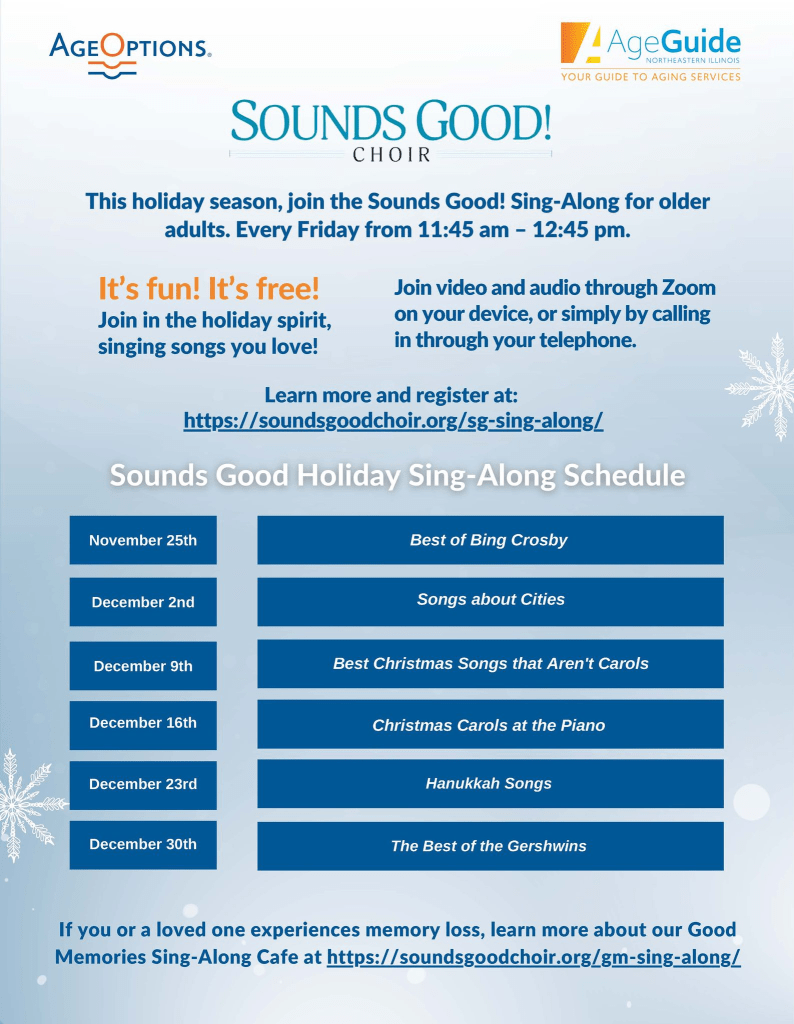 The Sounds Good Choir will be hosting FREE Holiday Sing-A-Long for older adults every Friday from 11:45 AM – 12:45 PM! Join in the holiday spirit, singing songs you love! Join through Zoom or simply by calling in through your telephone. Learn more and register at: https://soundsgoodchoir.org/sg-sing-along/