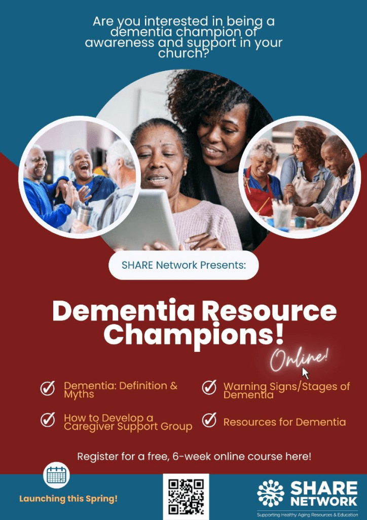 Are you passionate about learning more about dementia? SHARE Network is excited to announce the launching of Dementia Resource Champions Online! You can use your knowledge and expertise to help make a positive impact in your church and community.