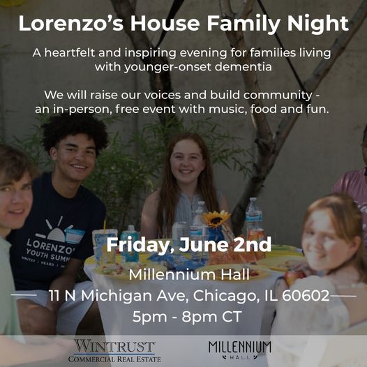 Young people whose lives have been impacted by a loved one diagnosed with dementia are invited to join Lorenzo’s House today, Friday, June 2nd on Chicago’s Michigan Avenue (The Mag Mile), for an evening of Connection & Light!