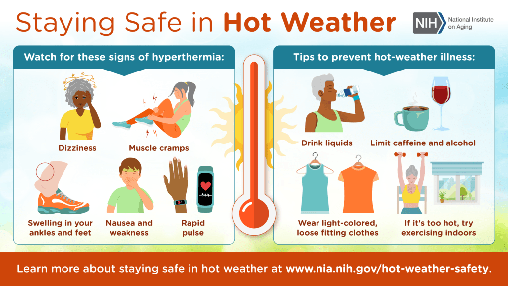 Hot weather makes it harder for the body to regulate its temperature. It can also be challenging for older adults, who typically do not adjust as well as others to sudden temperature changes. Older adults are also more likely to have heat-related health issues such as hyperthermia. Knowing the signs of hyperthermia and taking steps to prevent hot-weather illness can help.
