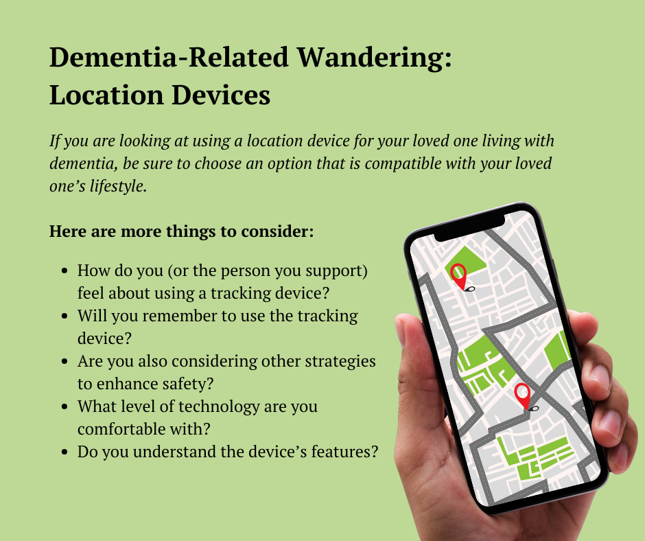 - One important preparation that many caregivers consider is using a location tracking device to track your loved one who wanders. They come in various forms, such as bracelets, shoe inserts, watches, and more, so be sure to choose an option that is compatible with your loved one’s lifestyle and your comfort level with technology.