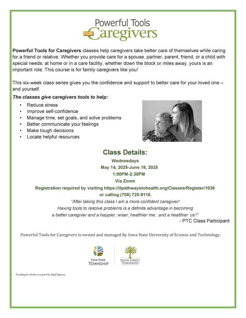 “Powerful Tools for Caregivers” is a six-week virtual class series that aims to help caregivers take better care of themselves while caring for a friend or relative. The classes give caregivers tools to help reduce stress, manage time, set goals, solve problems, and locate helpful resources.