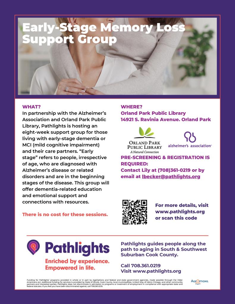 Pathlights will soon begin hosting an Early-Stage Memory Loss Support Group at the Orland Park Public Library. This is an eight-week support group for those living with early-stage dementia or MCI (mild cognitive impairment) and their care partners. “Early stage” refers to people, irrespective of age, who are diagnosed with Alzheimer’s Disease or related disorders and are in the beginning stages of the disease.