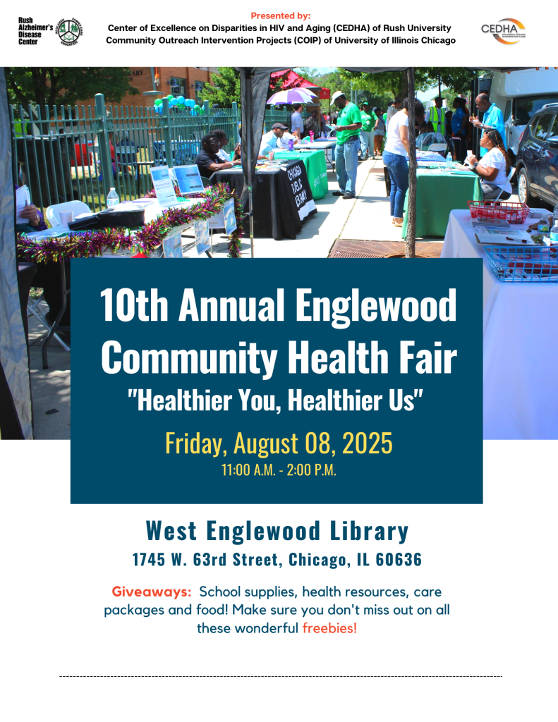 It’s almost time! The 10th Annual Englewood Community Health Fair is taking place on August 8th from 11:00a.m. to 2:00p.m.