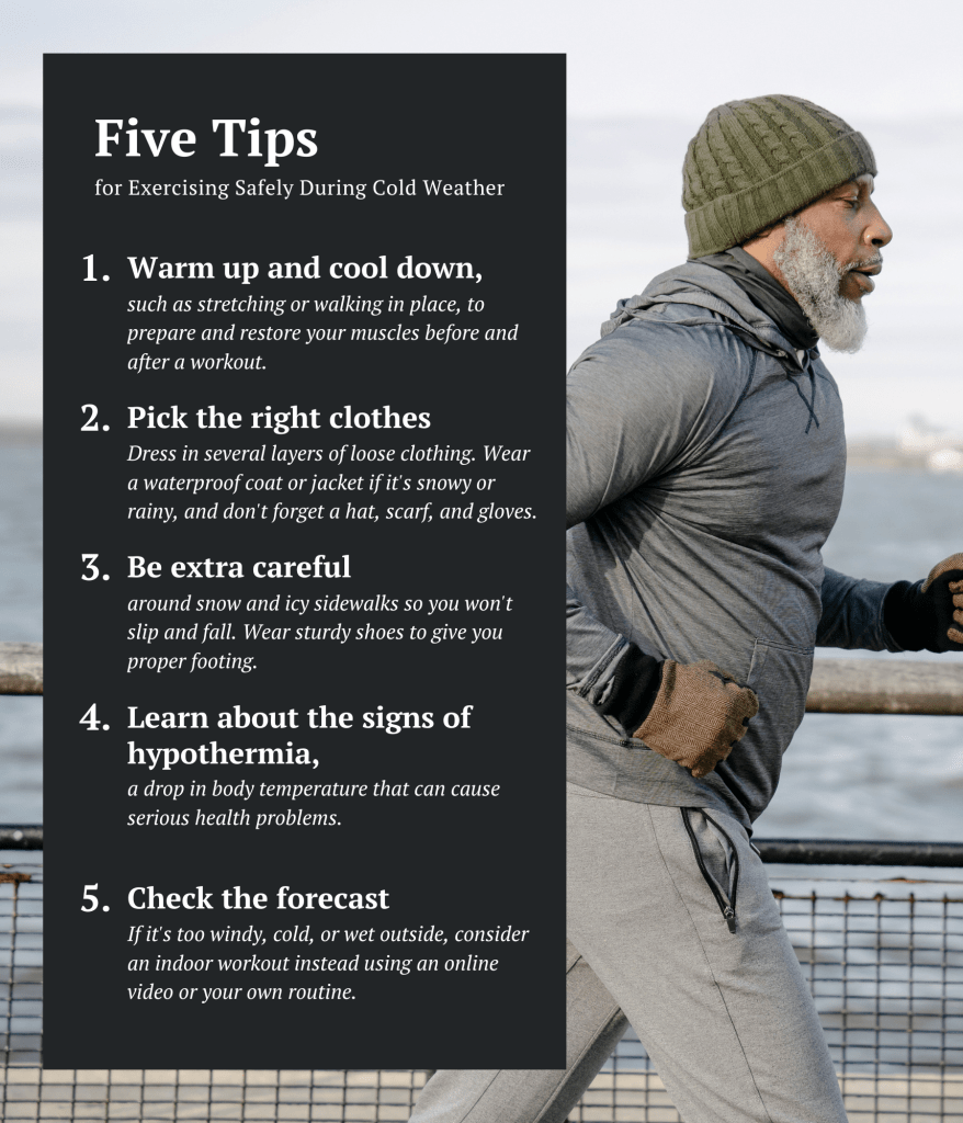 Even when it’s cold, you may be able to exercise outdoors. Be sure to follow these tips to stay safe in the winter.