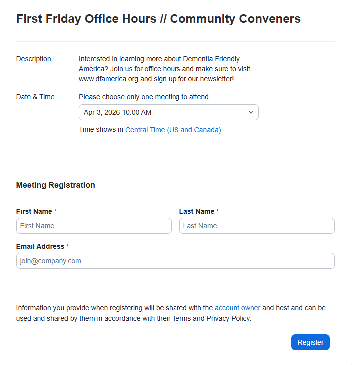 | Thank you to all who joined us for our first Dementia Friendly America (DFA) First Friday Office Hours earlier this month—we had a wonderful turnout and an energizing conversation with community members from across the country. We’re excited to keep that momentum going and invite you to join us again virtually this Friday, April 3, from 11:00–11:45 AM ET! Our Office Hours are open, conversational sessions where you can learn more about DFA, ask questions, share what’s happening in your community and connect with others doing this important work. Whether you joined us in March or couldn’t make it, we’d love to see you on Friday for another great conversation. Looking forward to connecting soon! |