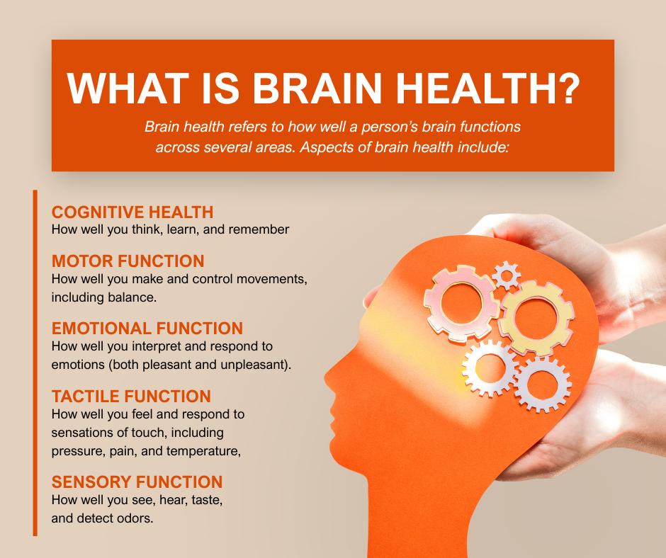 Brain health refers to how well a person’s brain functions across several areas. Cognitive health, or the ability to think, learn, and remember clearly, is just one aspect of overall brain health.